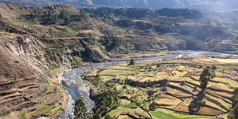 Vous poursuivrez votre ascension à travers l’Altiplano jusqu’en son point le plus élevé et pourrez admirer les sommets enneigés de l’Ampato (6380m) avant d’entamer la descente en direction du petit village de Chivay, connu pour ses sources chaudes et son marché typique. La vue au moment d’y arriver est splendide. Ce sont des terrasses à perte de vue qui découpent la vallée.