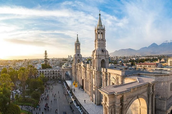 Arequipa, nichée entre la côte et les hautes terres du sud du Pérou, jusqu'aux Andes, avec un pic enneigé, comme le Ampato (6 288 mètres) le Chachani (6 075 m) et le Misti (5 825 m), volcans en activité, sources thermales et canyons parmi les plus profonds du monde : autant d’éléments qui caractérisent la situation naturelle exceptionnelle d’Arequipa. Ses édifices sont caractérisés par le sillar, une roche volcanique locale claire. « La ville blanche », est aussi une terre forte de traditions et un joyau andin : l’une des cités coloniales les plus remarquables d’Amérique du Sud, avec un centre historique riche de son passé colonial classé au Patrimoine Mondial de l’UNESCO depuis 2000. Agréable à vivre, située à une altitude modérée (2335 mètres), baignée par le soleil quasiment toute l’année, et à taille humaine, c’est une étape incontournable qui n’a rien à envier à Lima en termes d’histoire et de gastronomie.